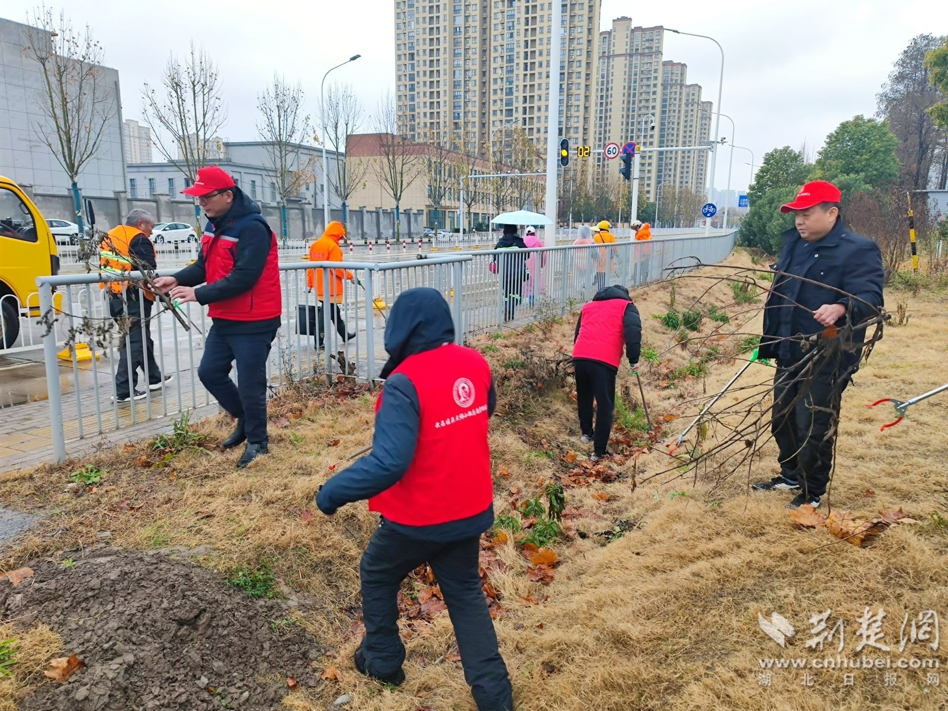 志愿者清理復(fù)興南路綠化帶雜物垃圾。 通訊員供圖