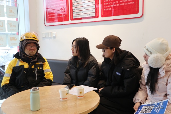 調(diào)研期間,實(shí)踐隊(duì)在街道統(tǒng)籌安排下,深入街道新就業(yè)群體服務(wù)驛站、新業(yè)態(tài)站點(diǎn)及“暖新聯(lián)盟”商家,通過(guò)實(shí)地走訪、座談交流、問(wèn)卷調(diào)研等形式,與一線騎手、站點(diǎn)負(fù)責(zé)人、社區(qū)工作者面對(duì)面溝通。他們?cè)敿?xì)了解新就業(yè)群體工作生活狀況、現(xiàn)實(shí)需求與參與基層治理意愿,重點(diǎn)調(diào)研志愿積分激勵(lì)、“五大員”培育、“黃小蜂助老送餐隊(duì)”等特色項(xiàng)目的運(yùn)行成效。街道以服務(wù)型治理搭建信任紐帶、引導(dǎo)新就業(yè)群體融入基層治理的工作模式,為高校專(zhuān)業(yè)研究提供了鮮活的實(shí)踐樣本。