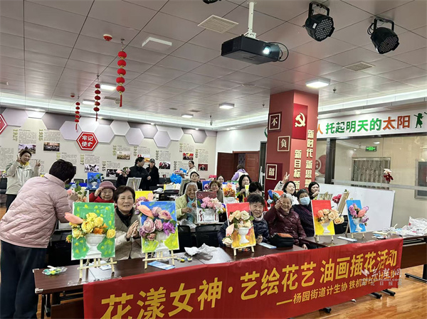 活動現(xiàn)場,長桌上整齊擺放著畫布、油彩、花材等材料。啟晨便民服務(wù)中心專業(yè)老師細致講解油畫色彩搭配、筆觸運用技巧,手把手指導(dǎo)花材修剪、造型搭配要領(lǐng),耐心解答大家的創(chuàng)作疑問。居民們興致盎然,或蘸取油彩在畫布上揮灑創(chuàng)意,暈染出五彩斑斕的專屬畫作;或?qū)W⑿藜艋ㄖΑ⒋钆鋵哟?,一束束生機盎然的花藝作品接連成型,鄰里間相互交流心得、分享技巧,現(xiàn)場笑語不斷。