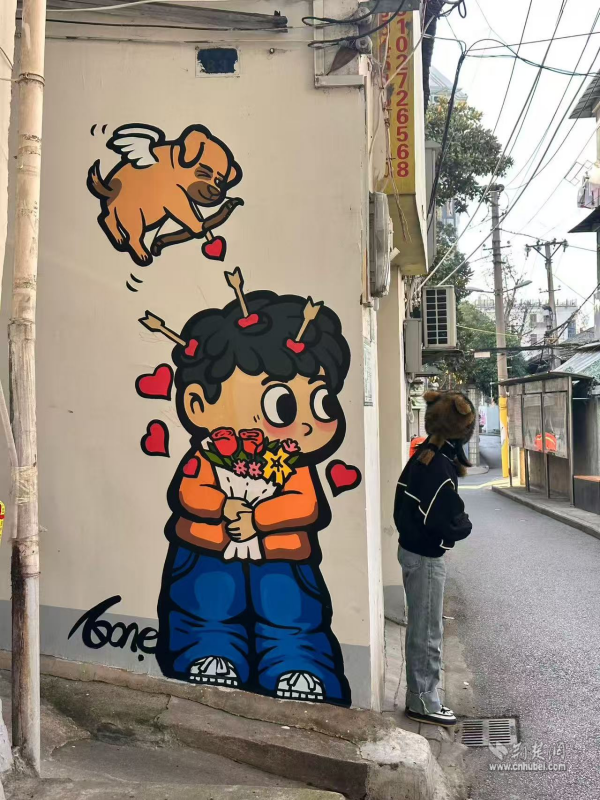 走出彭劉楊路地鐵B2口,來(lái)到社區(qū)八卦井旁,一面粉墻惹人注目,櫻花飛揚(yáng)、四只貓咪相依蹲坐。在社區(qū)攜手武漢學(xué)院藝術(shù)與傳媒學(xué)院青年志愿者開(kāi)展的“墻上生花,美在西廠(chǎng)”主題活動(dòng)中,10余名青年志愿者用畫(huà)筆和創(chuàng)意,打造出這面繪有櫻花和貓咪的“武漢”主題墻。
