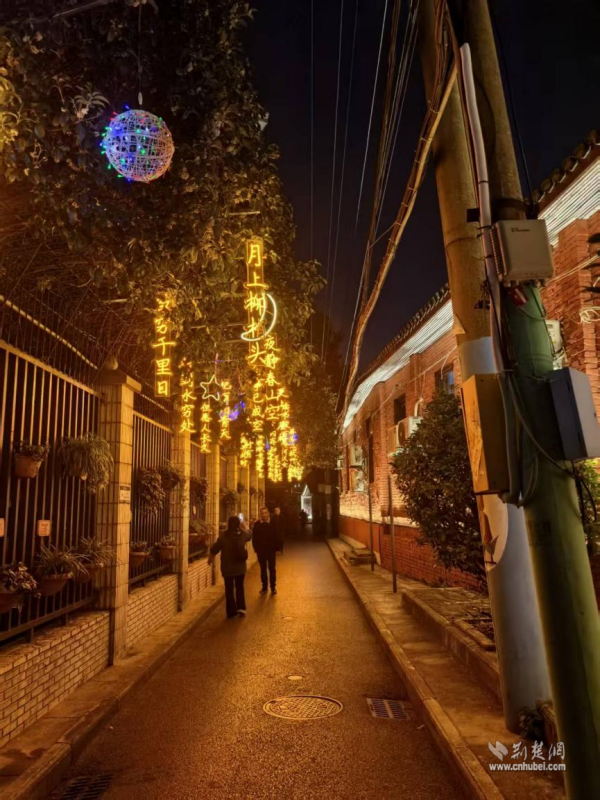 這個(gè)由社區(qū)與共建單位湖北省農(nóng)業(yè)事業(yè)發(fā)展中心共同策劃改造的“詩(shī)詞長(zhǎng)廊”,創(chuàng)新融合了詩(shī)詞文化與光影藝術(shù)。夜幕降臨,一盞盞詩(shī)詞燈帶悄然亮起。柔和光暈下,“晴川歷歷漢陽(yáng)樹(shù),芳草萋萋鸚鵡洲”的古韻與墻上“蒜鳥(niǎo)”“七飯”等俏皮的武漢方言點(diǎn)綴其間,歷史與當(dāng)下在光影交錯(cuò)間完成了隔空對(duì)話(huà)。