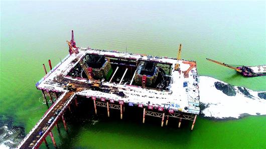 1月1日,建設(shè)者在赤壁長(zhǎng)江大橋上忙碌著。連日來(lái),中鐵大橋局五公司項(xiàng)目部廣大建設(shè)者放棄元旦節(jié)日休息,不分晝夜,不畏嚴(yán)寒,加緊 施 工 ,于2018年 12月31日完成南岸灘橋首個(gè)水中墩承臺(tái)施工。目前南岸灘橋11個(gè)水中墩承臺(tái),已經(jīng)開工9個(gè),各作業(yè)點(diǎn)全面開花。(視界網(wǎng)馬永斌 攝)