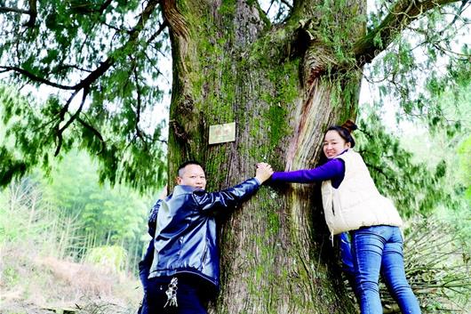 越往山里走,森林越茂密,古樹(shù)也越來(lái)多。在該村三組的一座老宅后,記者看到一片古樹(shù)群。最先映入眼簾的是一棵國(guó)家一級(jí)柏樹(shù),上面布滿黑褐色紋理,樹(shù)干得幾人合圍。不遠(yuǎn)處,還有國(guó)家二級(jí)杉榔、二級(jí)柏樹(shù)等,整個(gè)山坡,就被大大小小幾十棵大樹(shù)遮蔽,其中被掛牌保護(hù)的就有8棵?!拔覀兇逵?1個(gè)自然村灣,每個(gè)灣子都有這樣的原始老林,而且很多都已被掛牌保護(hù),這是村里最大的財(cái)富?!贝逯?shū)蔡世明說(shuō)。他還給記者講了個(gè)故事,有一年,一家知名公司的人看上這里的樹(shù),他們?cè)敢獬鰞r(jià)三萬(wàn)元,買(mǎi)走其中一棵,但村民們毫不心動(dòng),當(dāng)場(chǎng)就給拒絕了!