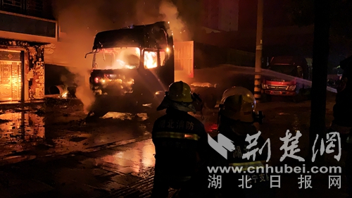 圖為消防指戰(zhàn)員撲滅貨車(chē)火災(zāi)現(xiàn)場(chǎng)?!⌒椭螖z