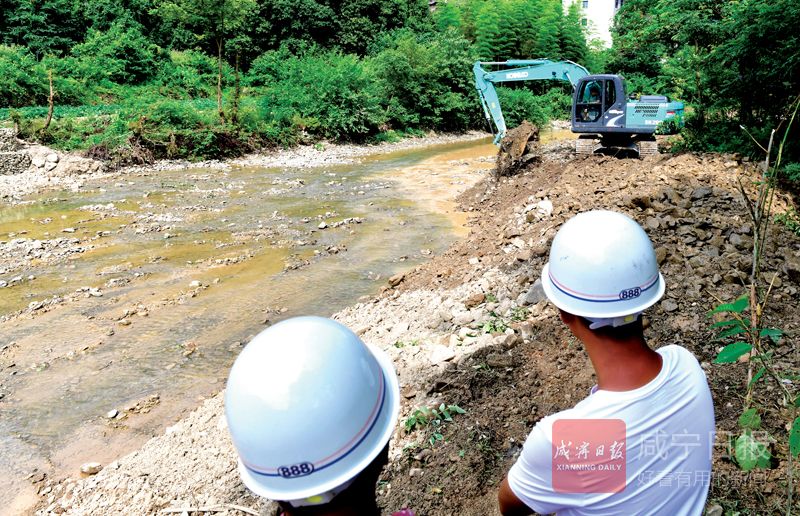 12日,崇陽縣白霓鎮(zhèn)河田港紙棚村段,大型挖掘機(jī)正在疏浚河堤護(hù)坡。