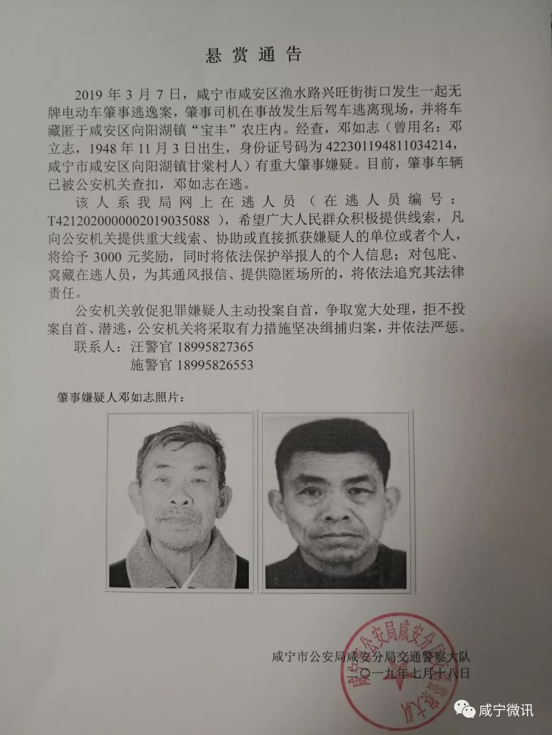 2019年3月7日,咸寧市咸安區(qū)漁水路興旺街街口發(fā)生一起無牌電動車肇事逃逸案,肇事司機在事故發(fā)生后駕車逃離現(xiàn)場,并將車藏匿于咸安區(qū)向陽湖鎮(zhèn)“寶豐”農(nóng)莊內(nèi)。經(jīng)查,鄧如志(曾用名:鄧立志,1948年11月3日出生,身份證號碼為422301194811034214,咸寧市咸安區(qū)向陽湖鎮(zhèn)甘棠村人)有重大肇事嫌疑。目前,肇事車輛已被公安機關(guān)查扣,鄧如志在逃。