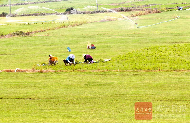 12日,赤壁市茶庵嶺鎮(zhèn)云臺(tái)山村青青草坪種植基地,工人正對(duì)草坪實(shí)施除雜、噴灌。