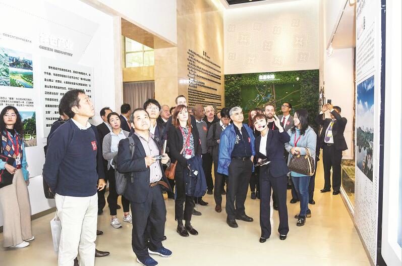 圖為:2019年10月16日,與會的中外專家學(xué)者參觀咸寧城市規(guī)劃館。