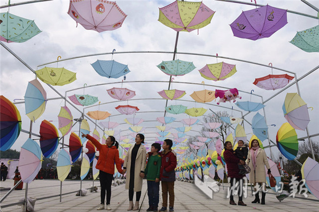 2019年2月2日,游客在通城縣塘湖鎮(zhèn)荻田村紅色廣場花傘“隧道游玩。