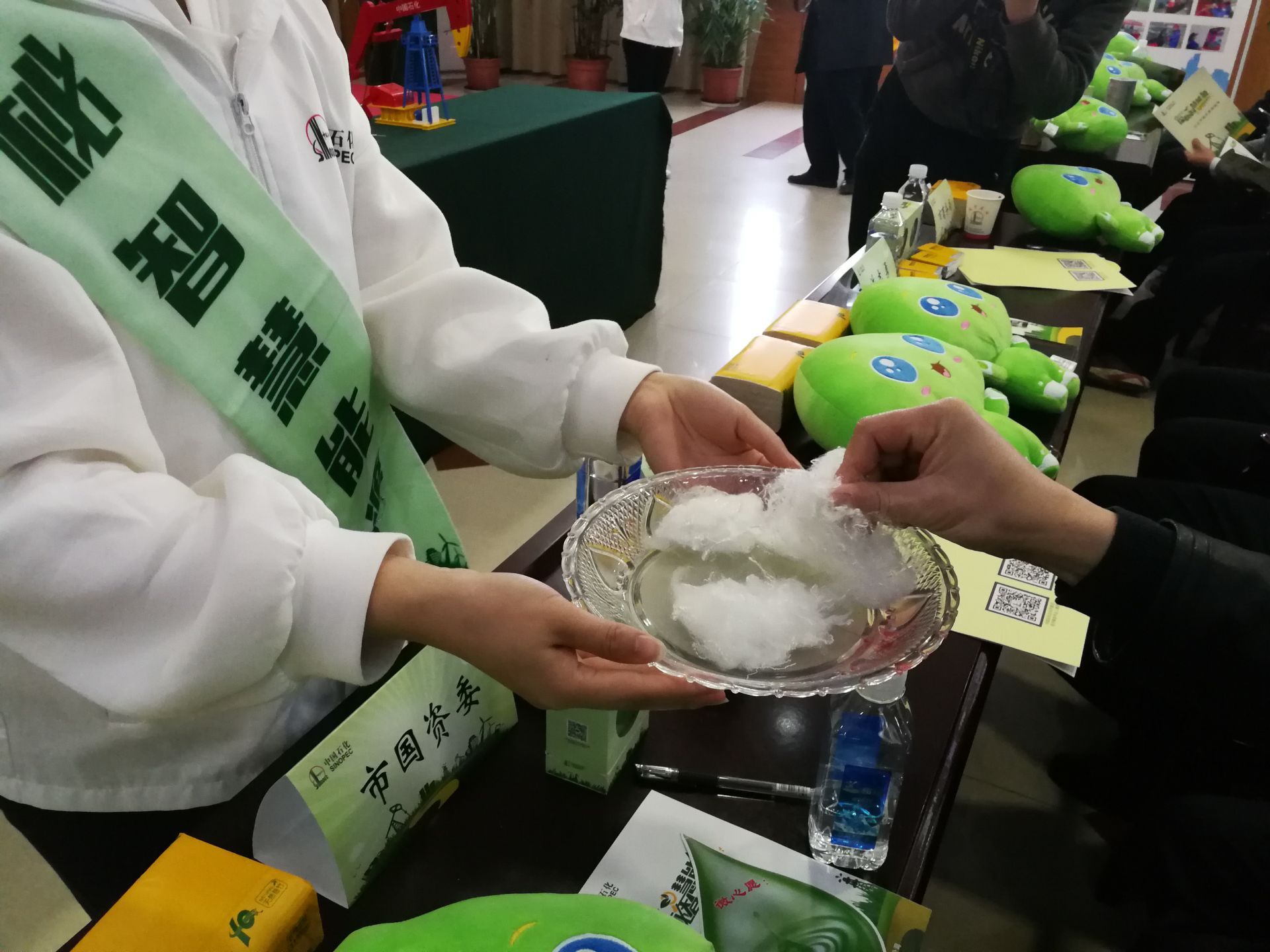 圖:咸寧社會公眾代表用手觸摸一種由石油制成可溶于水的新纖維。