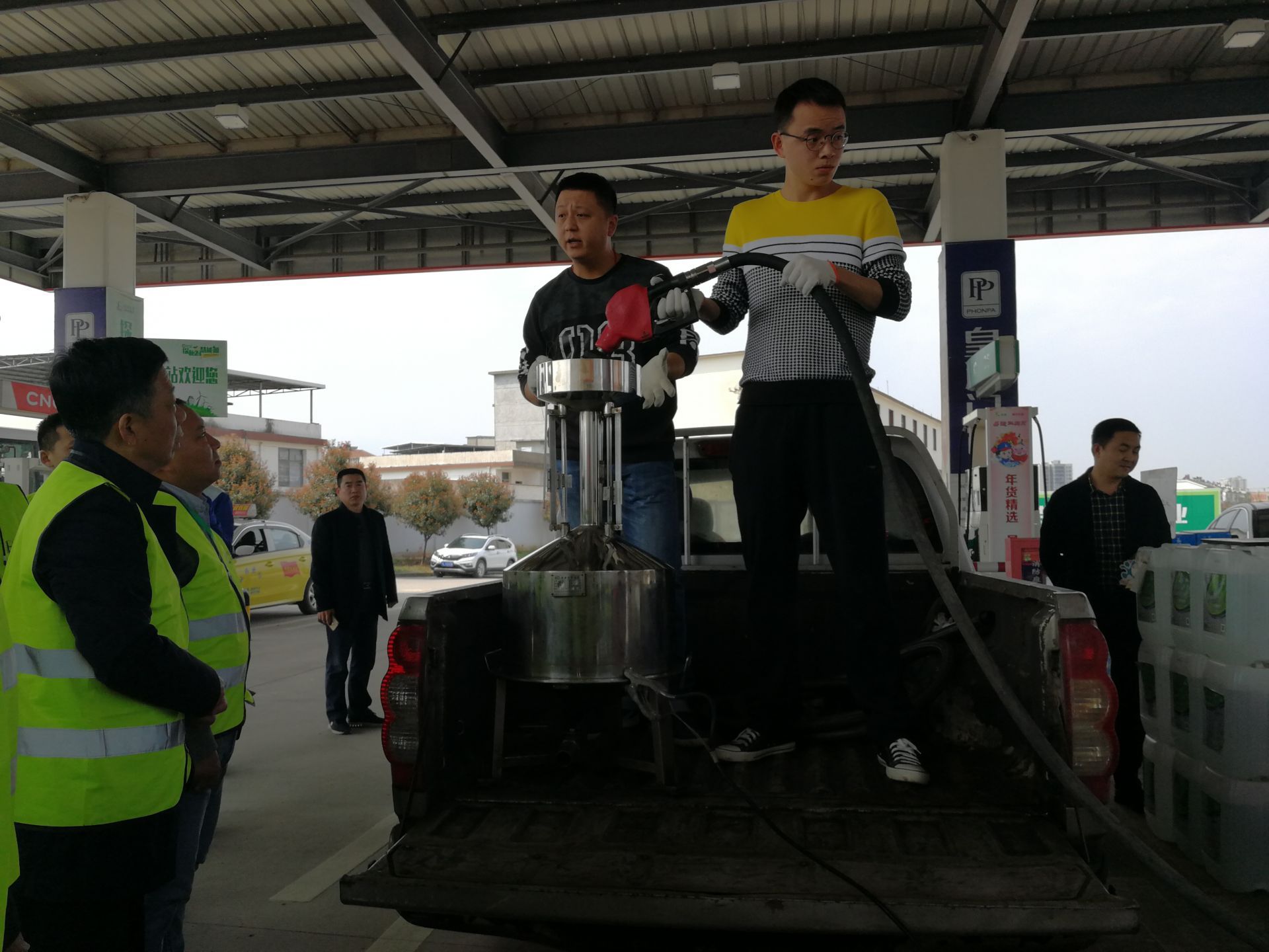 圖:咸寧市質(zhì)監(jiān)部門正在對賀泉加油站的加油裝置進行檢測。